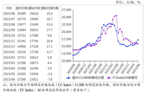 (三)內(nèi)外棉價(jià)差擴(kuò)大。CotlookA指數(shù)(相當(dāng)于國內(nèi)3128B級棉花)折合人民幣每噸14221元,比中國棉花價(jià)格指數(shù)(CCIndex)3128B級每噸低3045元,價(jià)差比上月擴(kuò)大1125元。進(jìn)口棉價(jià)格指數(shù)(FCIndex)M級(相當(dāng)于國內(nèi)3128B級棉花)月均價(jià)每磅92.86美分,1%關(guān)稅下折到岸稅后價(jià)每噸15919元,比國內(nèi)價(jià)格低1704元,價(jià)差比上月擴(kuò)大1230元;滑準(zhǔn)稅下折到岸稅后價(jià)每噸16077元,比國內(nèi)價(jià)格低1546元,價(jià)差比上月擴(kuò)大1117元。