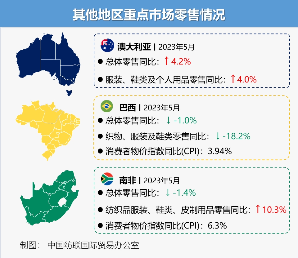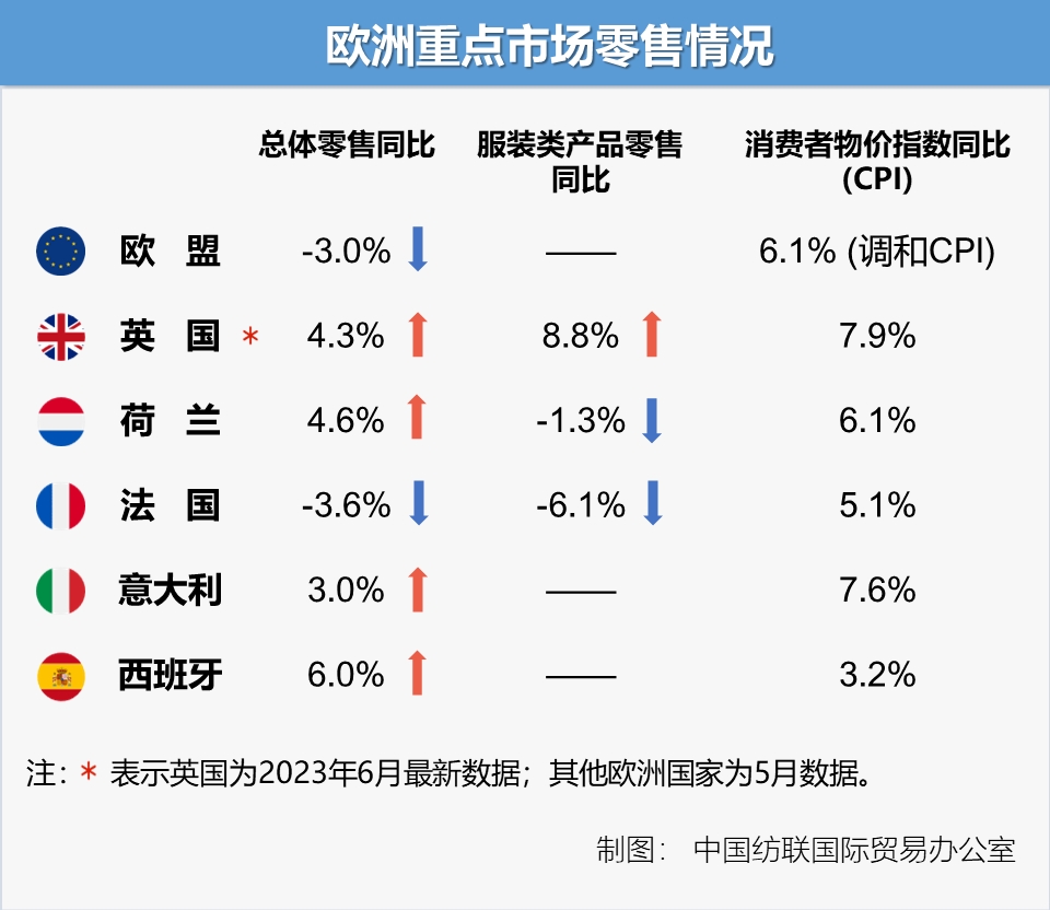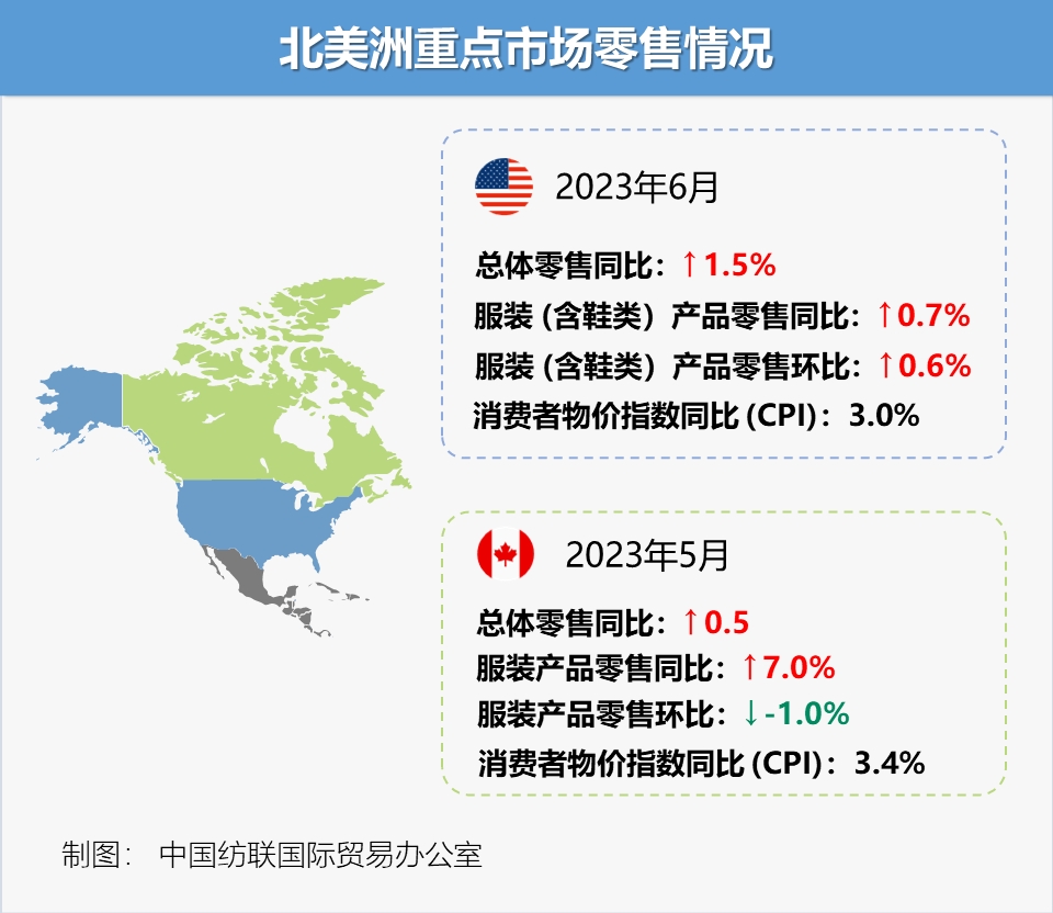 今年5-6月,中國、新加坡等亞洲市場服裝零售繼續(xù)保持增長;美國和加拿大隨著通脹率的逐步回落,服裝消費顯現(xiàn)出一定韌性,同比有所上升;荷蘭、法國等歐洲國家受加息影響服裝消費陷入負(fù)增長。