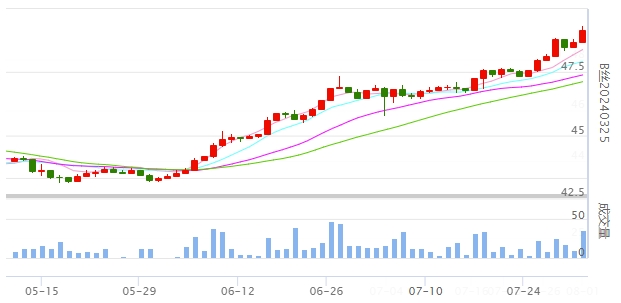 今日(2023年08月01日,周二)中國繭絲綢交易市場生絲指數(shù)上漲0.64%收于4777.48點(diǎn)。B絲(商檢4A級生絲):230825合約上漲0.27萬元報(bào)收于47.49萬元;230925合約上漲0.24萬元報(bào)收于47.85萬元;240325合約上漲0.45萬元報(bào)收于49.14萬元。