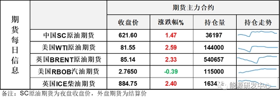 【1】WTI主力原油期貨收漲2.06美元,漲幅2.59%,報(bào)81.55美元/桶;布倫特主力原油期貨收漲1.94美元,漲幅2.33%,報(bào)85.14美元/桶;INE原油期貨收漲1.47%,報(bào)621.6元。