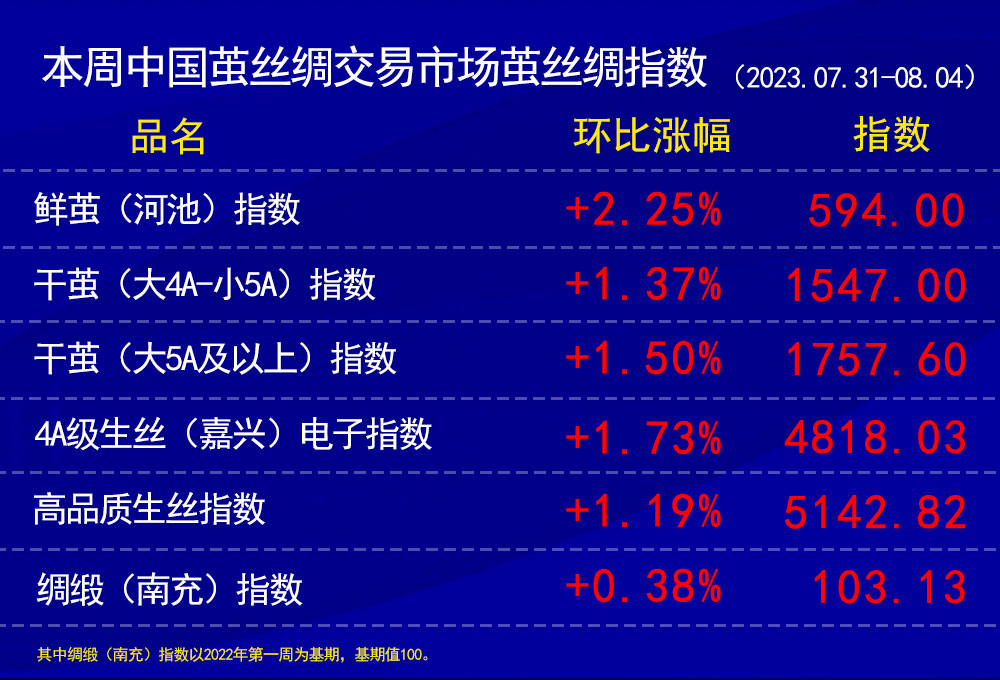 干繭價(jià)格指數(shù)上,本周采樣點(diǎn)包括四川、江蘇、廣西、云南等地區(qū),現(xiàn)貨拿貨積極,兩個(gè)等級(jí)的干繭價(jià)格指數(shù)繼續(xù)有所走高,分別上漲1.37%和1.50%。