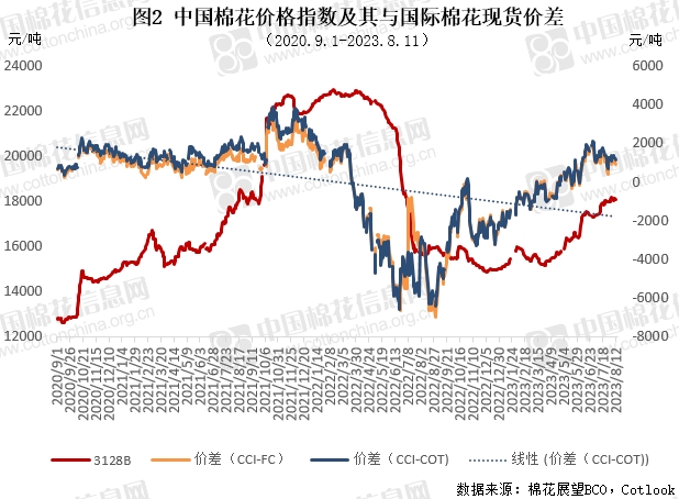 國內(nèi)方面,產(chǎn)業(yè)層面新疆棉減產(chǎn)預(yù)期已逐步消化,在儲備棉持續(xù)交易下,供應(yīng)緊張局面有所改善,并且目前下游需求仍顯弱勢,再加上國內(nèi)CPI、PPI、信貸數(shù)據(jù)等宏觀數(shù)據(jù)不及市場預(yù)期,棉價承壓運(yùn)行,鄭棉主力在17100元/噸附近區(qū)間震蕩?,F(xiàn)貨方面,貿(mào)易商出貨意愿較強(qiáng),但紡企因生產(chǎn)利潤持續(xù)虧損,僅有部分企業(yè)由于生產(chǎn)需要以剛需采購為主,再加上儲備棉以100%成交率連續(xù)成交,市場上現(xiàn)貨整體成交有限。中國棉花價格指數(shù)CC Index3128B周均價為18112元/噸,環(huán)比上漲5元/噸。與國際棉花現(xiàn)貨價格相比,F(xiàn)C index M周均價1%關(guān)稅與中國棉花價格指數(shù)價差縮小至1064元/噸;Cotlook A周均價1%關(guān)稅與中國棉花價格指數(shù)價差擴(kuò)大至1269元/噸。