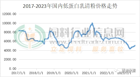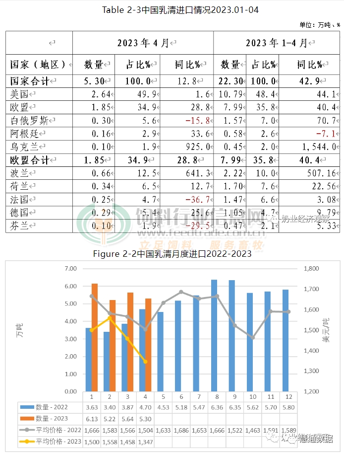 據中國海關統(tǒng)計,2023年1-6月中國共進口乳清類33.34萬噸,同比增加31.7%;進口額4.85億美元,同比增加19%,平均價格為1454美元/噸,同比下降9.6%。其中,從美國進口15.86萬噸,占47.6%,同比增加22.5%;歐盟進口11.74萬噸,占35.2%,同比增加35.1%;白俄羅斯進口2.78萬噸,占8.3%,同比增加94.4%。