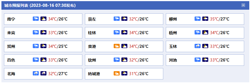 南寧市:今天白天多云有陣雨或雷雨、局地大雨,今天晚上多云、局地有陣雨,偏南風1~2級,最高氣溫34℃,最低氣溫26℃。