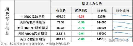 【1】WTI主力原油期貨收跌1.61美元,跌幅1.99%,報79.38美元/桶;布倫特主力原油期貨收跌1.44美元,跌幅1.7%,報83.45美元/桶;INE原油期貨收漲0.03%,報656.3元。