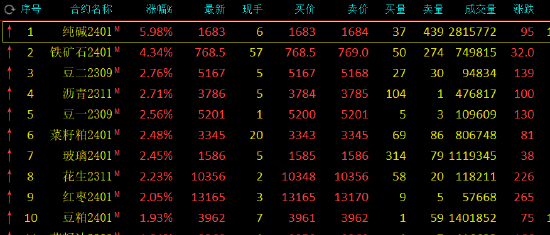 午盤收盤,國內(nèi)期貨主力合約多數(shù)上漲,純堿漲近6%,鐵礦(771, 21.50, 2.87%)石漲超4%,豆二、瀝青(3776, 26.00, 0.69%)、豆一漲超2%。跌幅方面,生豬、淀粉(2921, 1.00, 0.03%)、棉花(16680, -105.00, -0.63%)跌超2%。