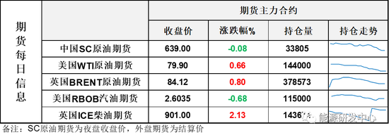 【1】WTI主力原油期貨收漲0.52美元,漲幅0.66%,報79.9美元/桶;布倫特主力原油期貨收漲0.67美元,漲幅0.8%,報84.12美元/桶;INE原油期貨收跌0.08%,報639元。