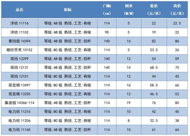 本周綢緞指數(shù)協(xié)作單位成交價(jià)格區(qū)間