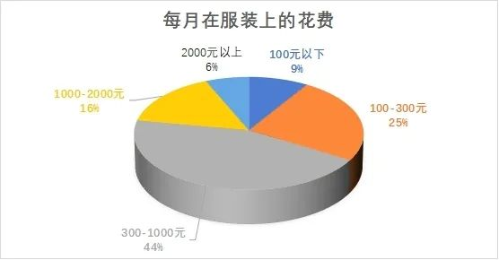 受訪的消費(fèi)者中有34.01%的人表示在服裝上的總體消費(fèi)是減少了的,其中12.9%還是明顯減少的。僅有16.82%的受訪者表示消費(fèi)在增加。這一數(shù)據(jù)好于去年,但是不及疫情前的數(shù)據(jù)。對(duì)于每個(gè)月用在服裝上的花費(fèi),大多數(shù)受訪者選擇了在300-1000元之間,這一比例占到44.28%,其次是100-300元之間,這一比例是24.73%。從近幾年調(diào)查的數(shù)據(jù)看,去年是個(gè)低谷,目前的消費(fèi)能力在逐步恢復(fù)中。