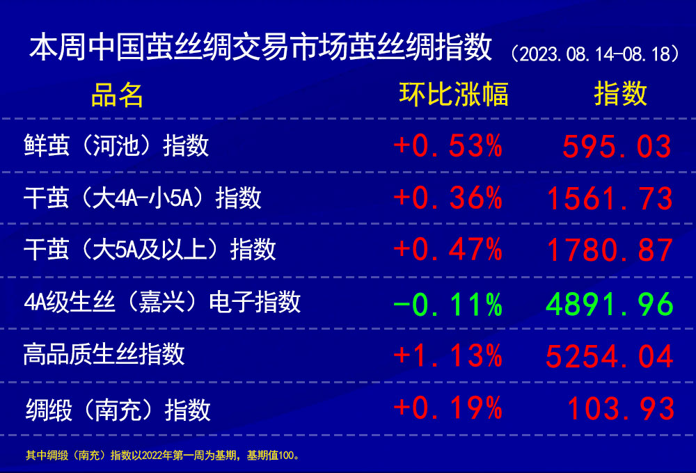 鮮繭指數(shù)上,本周由廣西百色和廣東等區(qū)外夏繭收購(gòu)至廣西的數(shù)據(jù)組成,質(zhì)量指標(biāo)偏差,轉(zhuǎn)換成基準(zhǔn)價(jià)格指數(shù)后環(huán)比上漲0.53%。