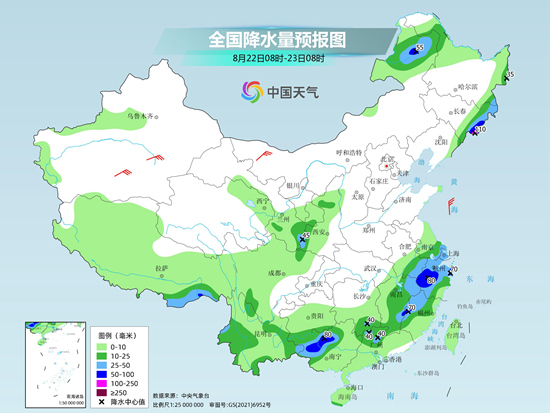 中東部大范圍降雨天氣過程仍在繼續(xù)!今天(8月22日),強降雨落區(qū)進一步南壓,云南到江南東部一帶雨水明顯增多,其中浙江、廣西等地部分地區(qū)或現(xiàn)大到暴雨,需注意防范。此外,中東部地區(qū)由于未來兩天雨水較多,高溫天氣整體呈現(xiàn)縮減趨勢,但南方地區(qū)由于濕度較高,悶熱天氣還將繼續(xù)控場。