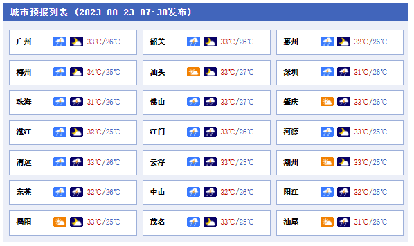 今天(8月23日),廣東依然是多分散性雷雨的一天。預(yù)計(jì)韶關(guān)、清遠(yuǎn)、珠三角的南部市縣和粵西沿海市縣局地將現(xiàn)大雨,由于濕度較高,各地悶熱感依然明顯。